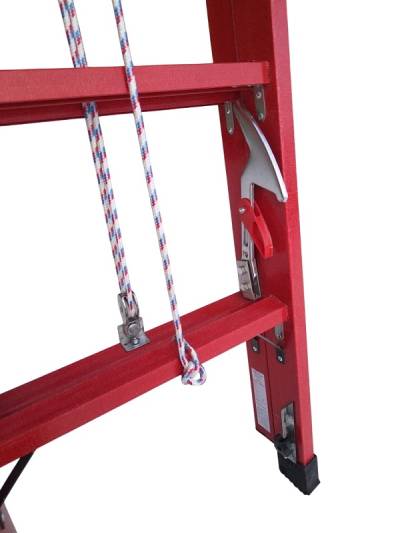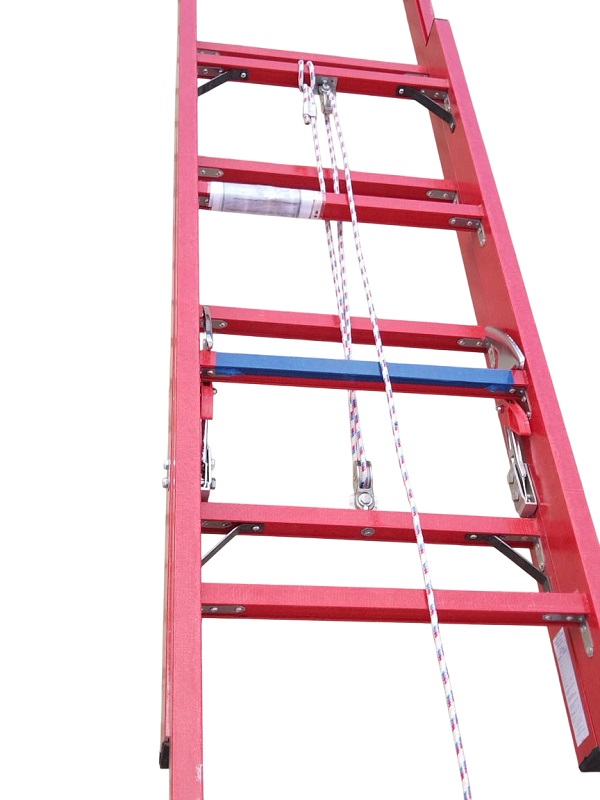 Лестница стеклопластиковая ЛСПР-9,0АКМ-70 (с тросом) приставная раздвижная, траверса, колеса, крюки, металлические оконцеватели, с абразивным покрытием ступеней h=9000мм