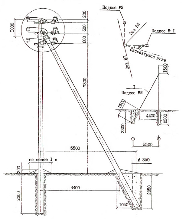 Данная опора представляет собой подкосную конструкцию с закреплёнными хомутами на стойке траверсами, что позволяет выполнить их сборку и установку в пробуренные котлованы укрупнёнными монтажными блоками.
