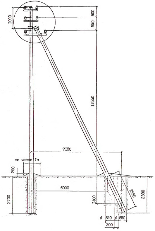 Данная опора представляет собой подкосную конструкцию с закреплёнными хомутами на стойке траверсами, что позволяет выполнить их сборку и установку в пробуренные котлованы укрупнёнными монтажными блоками.